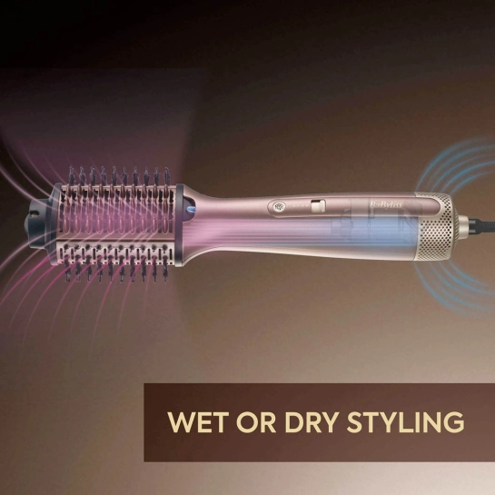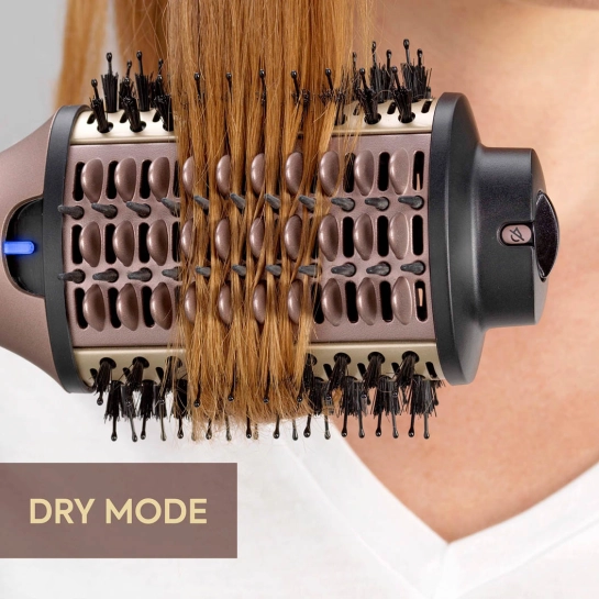 Однією з ключових переваг моделі є підтримка режиму Wet & Dry, що дозволяє створювати укладку прямо на вологому волоссі. У режимі Wet відкриті всі виходи гарячого повітря, що забезпечує одночасну сушку та формування зачіски. Переключивши пристрій у режим Dry, ви отримуєте більш делікатну подачу повітря — ідеальну для фінального оформлення та освіження укладки.