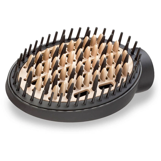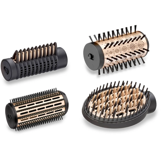 Для продуманої та багатофункціональної укладки виробник оснащує модель декількома насадками. Фіксована щітка з жорсткими щетинами 38 мм чудово підходить для густішого або короткого волосся, забезпечуючи чітку форму. Насадка-випрямлювач допомагає досягти гладкості, а термощітка з випрямляючим ефектом дозволяє активно укладати волосся, зберігаючи їх природний блиск і м’якість.