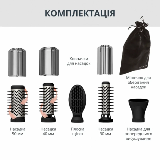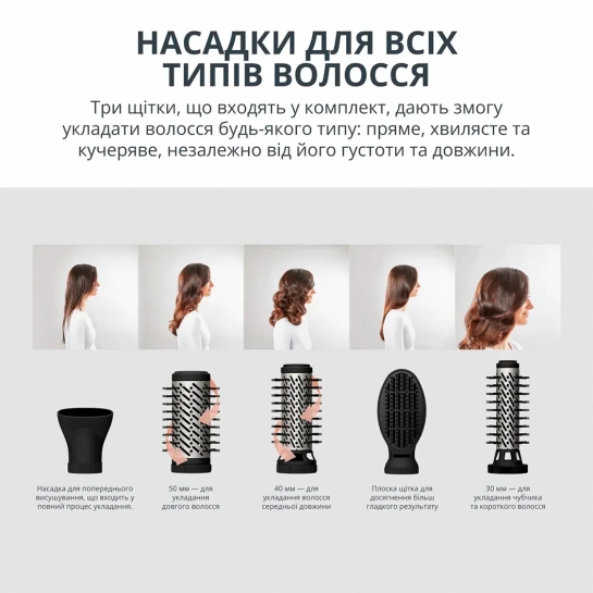 Три щітки, розроблені спільно з професіоналами для ідеального індивідуального укладання: одна щітка 50 мм для тонкого волосся, інша 50 мм для густого волосся і третя, 38 мм, для чубчика та короткого волосся.