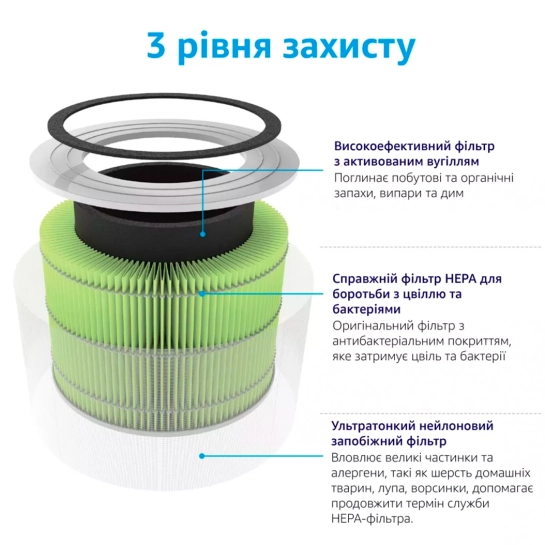 Фільтр утримає 99,97% шкідливих домішок у повітрі розміром 0,3 мікрона. Летючі речовини, шерсть, дим, пил, пилок, пилові кліщі, суперечки плісняви, кухонні запахи, бактерії, віруси, аромати свійських тварин — все це більше не зіпсує ваш простір і не вплине на настрій та відмінне самопочуття.