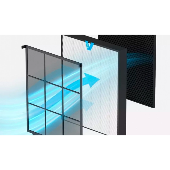 Загалом фільтр складається з 3-ступінчастої системи. Попередній фільтр подбає про великі частки вовни, волокон тощо, продовжуючи термін служби наступних фільтрів. НЕРА-фільтр усуває 99,97% домішок розміром до 0,3 мкм (порівняно, середньостатистичний розмір бактерії становить 1-10 мкм), тобто він подбає про ваше здоров'я. А статистично заряджені волокна допомагають НЕРА затримувати 99,9% вірусів та 99,99% мікробів. Фільтр з активованим вугіллям руйнує неприємні запахи, леткі сполуки, випаровування, дим тощо.
