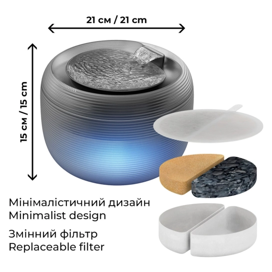 Виконаний у сучасному мінімалістичному дизайні, який легко впишеться в будь-який інтер’єр. Компактні розміри 21×21×15 см дозволяють розмістити поїлку в зручному для вихованця місці.