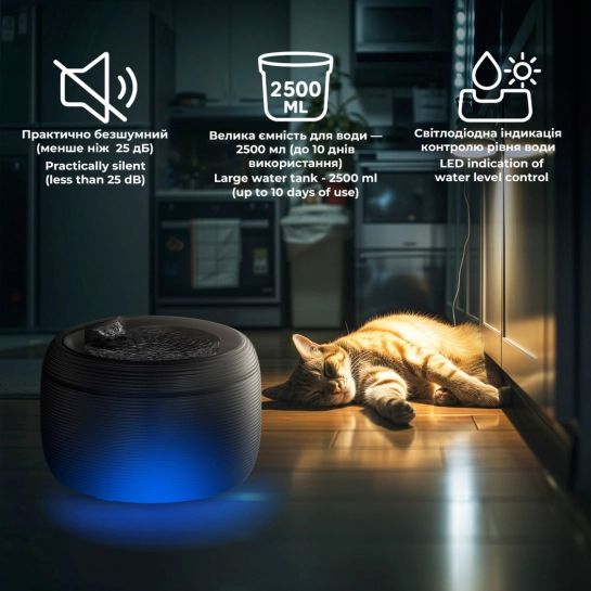 Практично безшумна робота (менше 25 дБ) не турбує тварин і не створює дискомфорту в будинку, дозволяючи використовувати поїлку цілодобово.