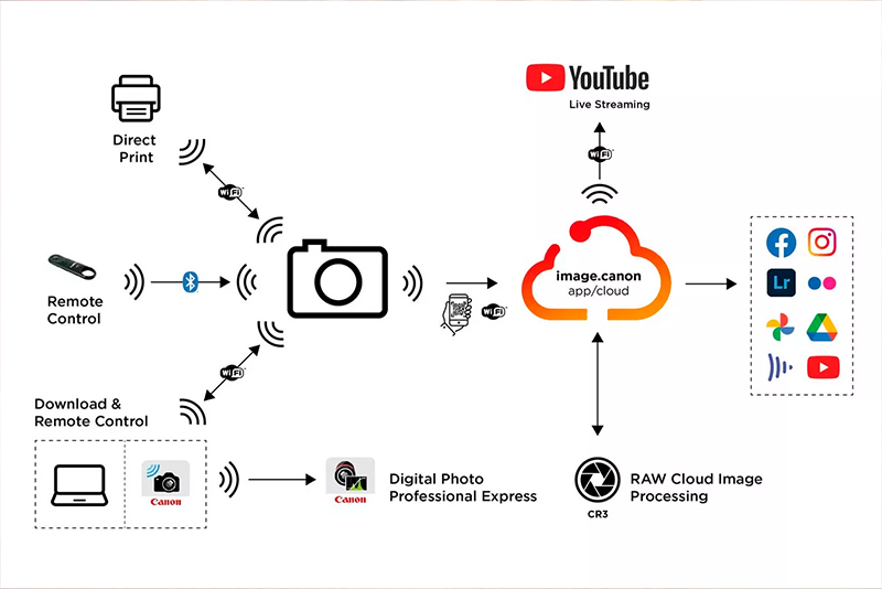 Вбудовані модулі Wi-Fi ® та Bluetooth ® забезпечують підключення EOS R8 до інтелектуальних пристроїв, мереж Wi-Fi та ноутбуків. Діліться фотографіями та відео з передплатниками та друзями, а також керуйте камерою дистанційно.