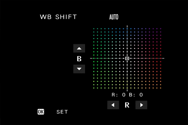 Для налаштування балансу білого доступні режими Auto, Custom, Color Temperature та кілька попередніх налаштувань. Додатково параметри можна налаштувати за допомогою функції WB Shift. Вона дозволяє точно регулювати відтінки за координатами червоного (R) та синього (B).