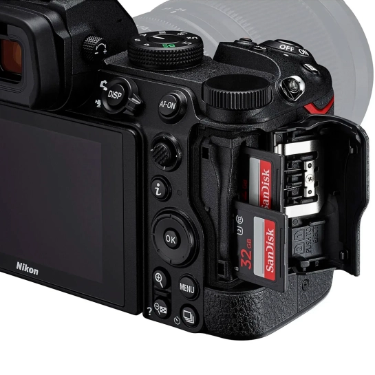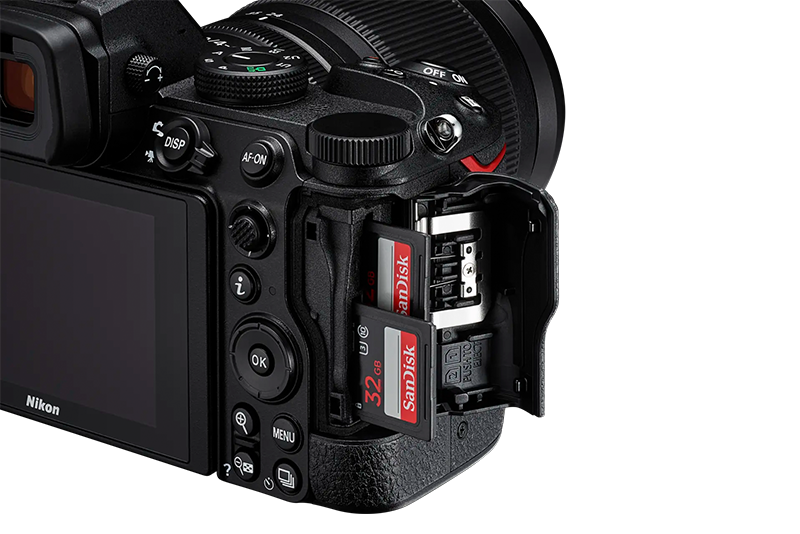 Подвійні роз'єми підтримують швидкі картки пам'яті SD стандарту UHS-II. Ви можете легко настроїти гнізда так, щоб на одну карту записувалися знімки та відео, а на іншу – їх резервні копії. Або ви можете зберігати фотографії на одну, а відео на іншу.