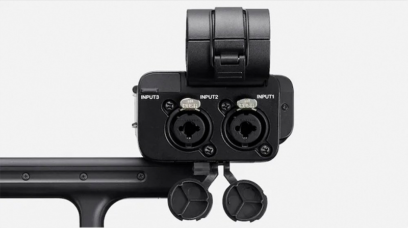 Ручку, оснащену перехідником XLR з двома повнорозмірними роз'ємами XLR, можна прикріпити до мультиінтерфейсного роз'єму на камері для зручнішої та стабільнішої роботи у складних умовах (наприклад, під час зйомки з нижнього ракурсу).