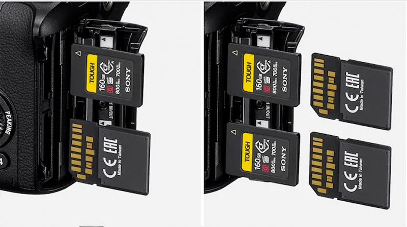 Карти CFexpress Type-A, розроблені з урахуванням вимог кіновиробництва, підтримують запис із високою швидкістю потоку даних. За допомогою двох ідентичних слотів, сумісних з картами CFexpress Type-A та звичайними SDXC UHS-I та UHS-II, можна проводити ретрансляційну або резервну зйомку.