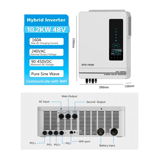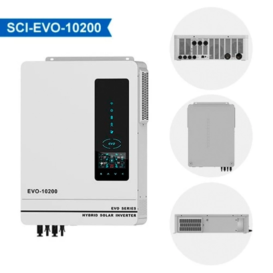 Автономний інвертор SCI-EVO-10200 виробляє електроенергію за допомогою сонячних панелей та подає її безпосередньо на навантаження. Надлишки зберігаються в акумуляторах. Інвертор має подвійний фотоелектричний вхід та подвійні виходи змінного струму, а також новий РК-дисплей. Ідеальне рішення для забезпечення автономного резервного харчування для будинків та малого бізнесу.
