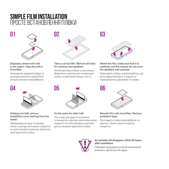Завдяки сучасному клейовому шару плівка міцно фіксується, не утворює бульбашок і не зміщується під час використання. Установка проста і не вимагає спеціальних навичок — достатньо акуратно поєднати плівку з дисплеєм, після чого вона самостійно адаптується до поверхні. За необхідності можна легко замінити захист без слідів і ризику пошкодження екрана.