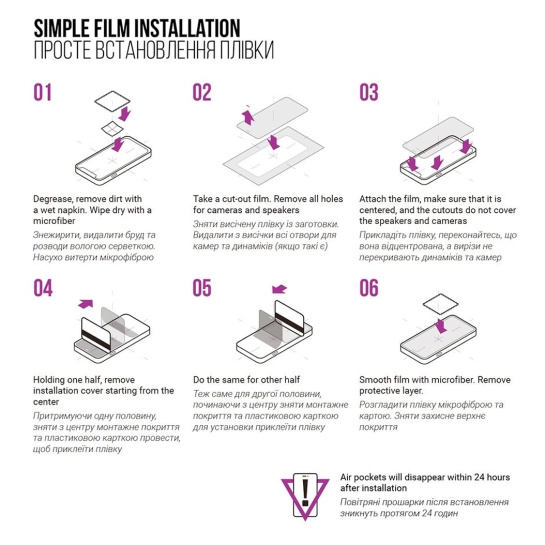 Завдяки сучасному клейовому шару плівка міцно фіксується, не утворює бульбашок і не зміщується під час використання. Установка проста і не вимагає спеціальних навичок — достатньо акуратно поєднати плівку з дисплеєм, після чого вона самостійно адаптується до поверхні. За необхідності можна легко замінити захист без слідів і ризику пошкодження екрана.