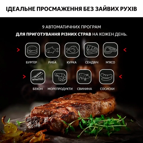 Ідеальний результат прожарювання від rare до well-done. Наша остання інновація – OptiGrill + Snacking & Baking XL – має в комплекті аксесуар для приготування закусок та випічки, який дозволяє випікати, нагрівати/розігрівати або підсмажувати різноманітні страви. Завдяки автоматичному сенсору приготування час і температура налаштовуються відповідно до товщини шматків і кількості інгредієнтів, розміщених на грилі, ґрунтуючись на 6 програмах приготування (бургер, птах, сендвіч, ковбаски, червоне м'ясо, риба), а також режим для приготування заморожених продуктів.