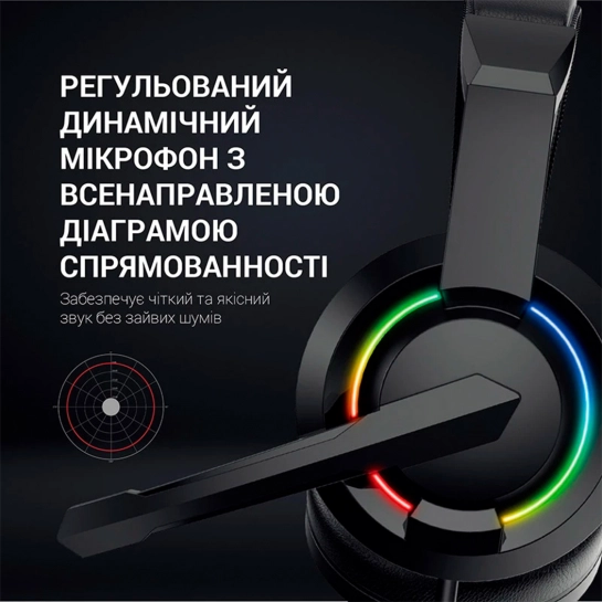 Кругові зони повнокольорового RGB-підсвічування на чашах гарнітури надають їй яскравого та сучасного вигляду. Це не тільки робить гарнітуру стильною, а й створює атмосферу під час гри, дозволяючи гравцям поринути у віртуальний світ. Яскраві ефекти підсвічування можуть бути налаштовані під особисті уподобання, додаючи особливості кожному ігровому сетапу.