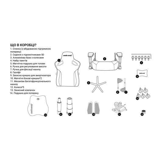 - 5D підлокітники регулюються вперед-назад; вгору-вниз; вліво-вправо; по кутку нахилу