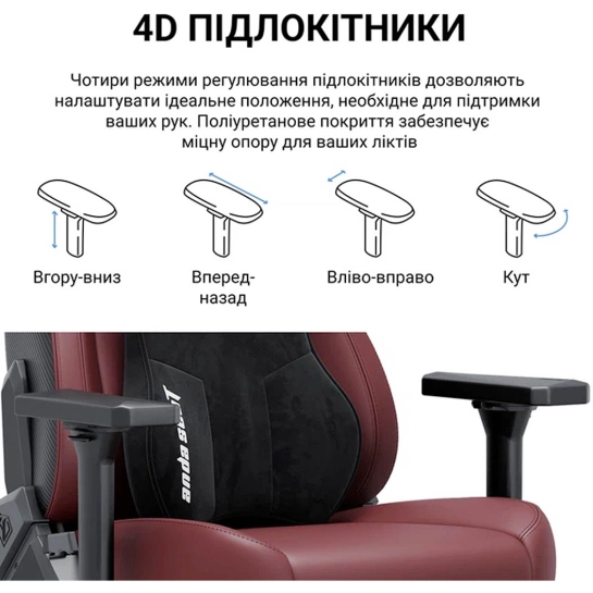 | Регулювання: | Кут нахилу спинки, Висота підлокітників, Жорсткість гойдання, Висота сидіння, Відстань підлокітників, Механізм хитання, Кут повороту підлокітників |