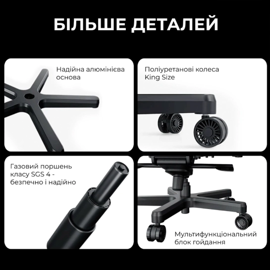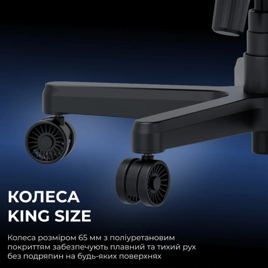 Металевий каркас та посилена база створюють стійку та довговічну конструкцію, здатну витримувати навантаження до 150 кг. Хрестовина оснащена прогумованими роликами, які забезпечують плавний і тихий рух будь-якою поверхнею без ризику пошкодити підлогове покриття. Середня вага крісла близько 28 кг свідчить про надійність конструкції та її стійкість до деформації.