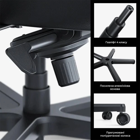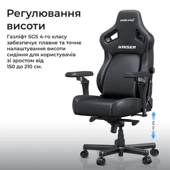 Газліфт 4-го класу забезпечує плавне регулювання висоти на 6.5 см, що підходить для користувачів зростанням від 150 до 210 см.