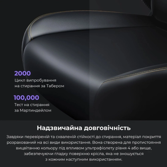 Високоякісна інноваційна синтетична шкіра стійка до плям і легко очищається, а також має довговічність та еко-відповідність стандартам OEKO-TEX та RoHS. Таким чином, ви можете швидко прибрати розлиту каву, крихти від закусок або сліди від домашніх тварин за допомогою вологої серветки.