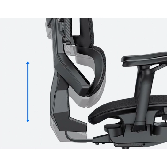 Завдяки збільшеній ширині області плечей забезпечується надійна підтримка навіть під час бічних рухів. Динамічна поперекова підтримка, інтегрована в спинку, активно реагує на рухи тіла, забезпечуючи постійну підтримку спини - незалежно від того, чи сидите ви прямо або відкидаєтеся назад. 5D підлокітники дозволяють налаштовувати висоту, глибину, ширину та кут повороту для оптимальної підтримки рук. 3D підголовник регулюється по висоті та куту нахилу, забезпечуючи підтримку шиї та голови. Регулювання висоти спинки з 7 рівнями дозволяє адаптувати крісло до користувачів зростом до 190 см.