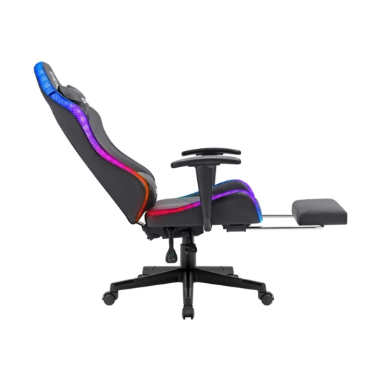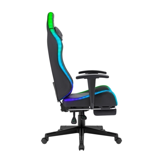 Ігрове крісло Energy розраховане на користувачів до 110 кг та зростом до 185 см, з газліфтом 4 класу. Висота крісла варіюється від 125 до 135 см, сидіння – від 42 до 52 см, його ширина становить 47 см, глибина – 52.5 см. Спинка має висоту 80 см та ширину 49 см, підлокітники регулюються по висоті від 69 до 79 см. Крісло оснащене регулювання висоти, нахилу спинки до 135°, і поперекової подушки. Має вбудовану RGB-підсвічування, підголовну та поперекову подушки, спинку з бічною підтримкою. Каркас виконаний з фанери, оббивка – з еко-шкіри, наповнювач – пінополіуретан високої щільності. Колір – чорний, вага – 14.8 кг.