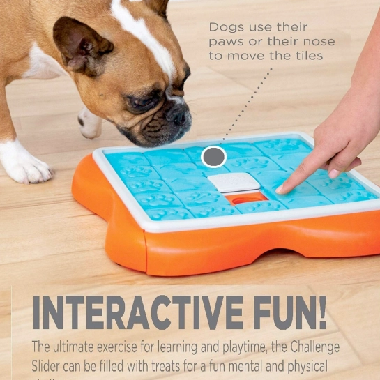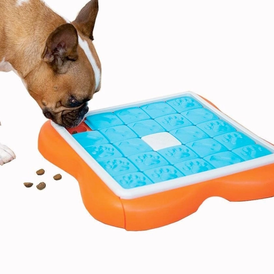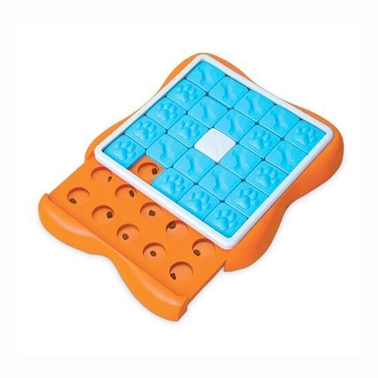 - ЯК ГРАТИ: покладіть улюблені ласощі вашого собаки в відділення знімного піддону. Вставте піддон на місце. Покажіть собаці, як працюють п'ятнашки, і запросіть до гри. Якщо собаці важко працювати лапами, покладіть гру на стілець або інше місце, щоб собаці було зручно переміщати п'ятнашки за допомогою носа.