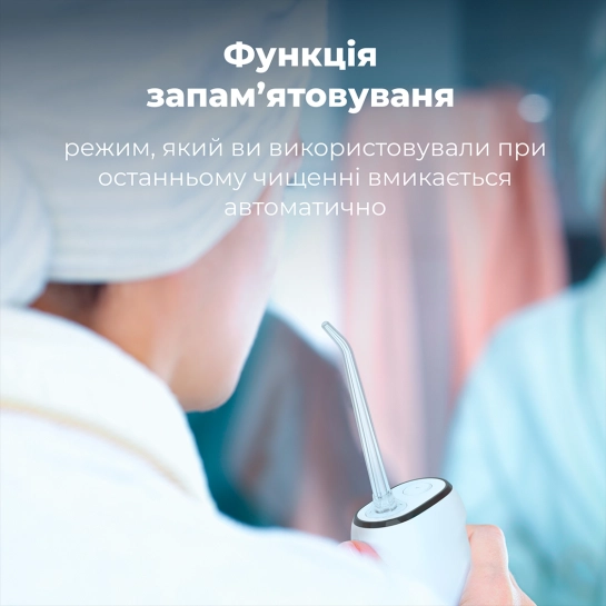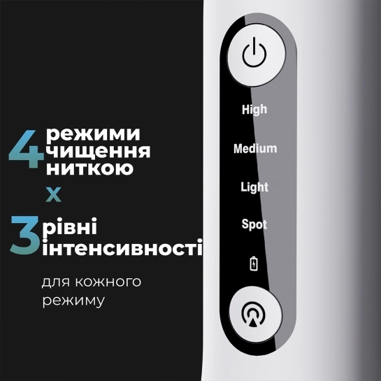 Три режими - легкий, середній та високий, забезпечують спектр інтенсивності та тиску струменя води для різних станів зубів, ясен та їх чутливості. Підходить для тих, хто віддає перевагу м'якому чищенню зубів, а також для користувачів, хто потребує більш інтенсивного чищення, забезпечуючи індивідуальний і комфортний досвід. Точковий режим - для цілеспрямованого та потужного чищення певної ділянки. Кожен режим чищення іригатором має 3 додаткові рівні інтенсивності. Ця функція дозволяє точно налаштувати роботу іригатора, забезпечуючи ідеальний баланс між ретельним очищенням та дбайливим доглядом.