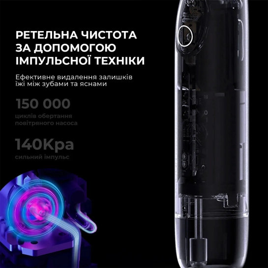Oclean W1 Purple оснащений надпотужним повітряним насосом. Тільки уявіть: 150 000 оборотів стискають повітря до 140 кПа. Під таким тиском струмінь води виприскується за 0,14 секунди. Таке поєднання збільшує силу імпульсу на 33% у поєднанні із звичайними іригаторами. А головне - завдяки пульсуючим рухам імпульс прибирає залишки їжі навіть у вузьких проміжках та підвісних кишенях. Після такої процедури зубний камінь просто не має шансів.