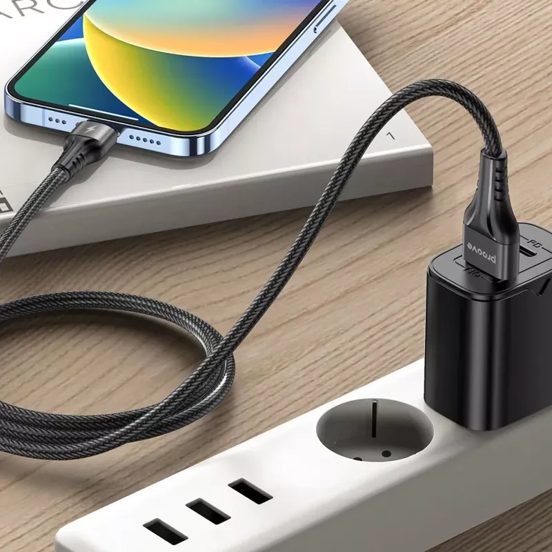 Кабель має гнучке обплетення з нейлону та додаткове посилення полімерними ущільнювальними перемичками. Завдяки цьому аксесуар захищений від механічних пошкоджень, а також вирізняється тривалим терміном служби. Компактний конектор надійно фіксується в роз'ємі, забезпечуючи стабільність передачі струму або сигналу. Метрової довжини кабелю Proove Double Way Weft достатньо для комфортного використання гаджета, який під'єднаний до ЗП або іншого девайсу.