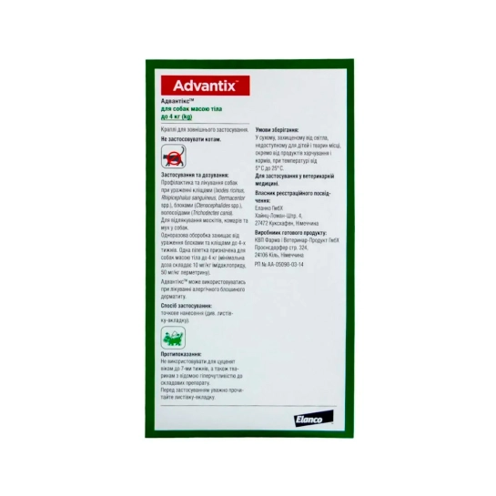 Характеристики для Краплі на загривку для собак Bayer Advantix для собак менше 4 кг (4 шт. по 0,4 мл) (54169)
