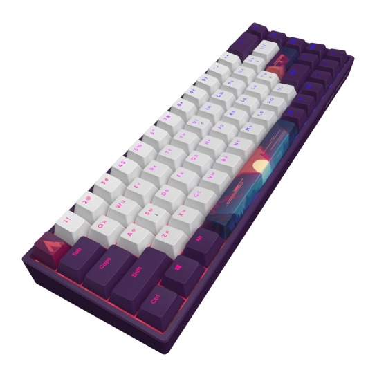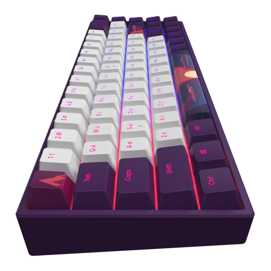 Ця ультракомпактна 65% клавіатура має фіолетово-білий колір. Вона оснащена механічними перемикачами G3MS Sapphire, клавішами PBT, виготовленими методом Double-Shot, з ENG/UA/ru символами, 100% настроюваним RGB-підсвічуванням, змазаними стабілізаторами і потужним програмним забезпеченням для персоналізованих налаштувань.