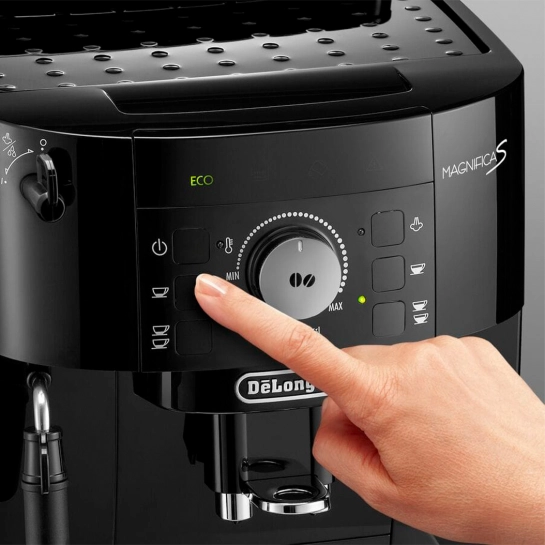 Кавомашина DeLonghi ECAM 22.112 B Magnifica S обладнана новою панеллю кнопки управління. Повертанням регулятора ви можете змінити міцність кави. Натискання кнопки дозволяє вибрати порцію необхідного об'єму. Температуру води або жорсткість за своєю перевагою можна запрограмувати у цій моделі кавоварки. Потужність приладу 1450 Вт. Тиск, що створюється у системі, становить 15 бар, це ідеальне значення для якісної екстракції кавового порошку.