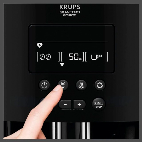 Krups не має ручного обслуговування. Промивання виконується за запитом вашої машини, чим забезпечується оптимальний рівень гігієни завдяки високотемпературним процесам, які ідеально видаляють кавову олію та залишки вичавків, не пошкоджуючи машину та заощаджують ваш час.