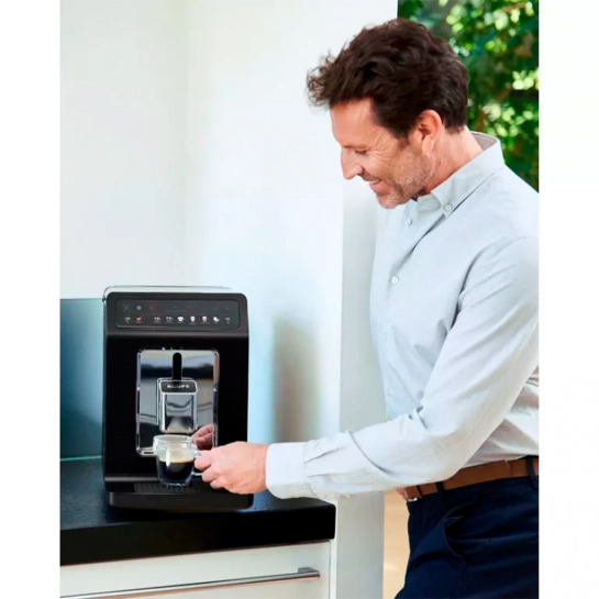 Абсолютно новий дизайн подарує незабутню перерву на каву завдяки великій ємності (резервуар для води об'ємом 2.3 л та відсік для кави зерен на 260 г), оптимальним пропорціям та ергономічному корпусу кавоварки.
