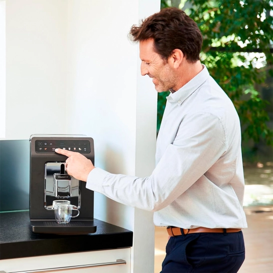 Абсолютно новий дизайн подарує незабутню перерву на каву завдяки великій ємності (резервуар для води об'ємом 2.3 л та відсік для кави зерен на 260 г), оптимальним пропорціям та ергономічному корпусу кавоварки.