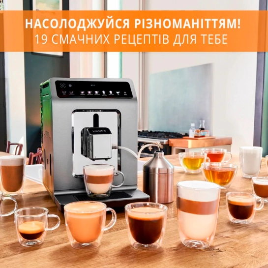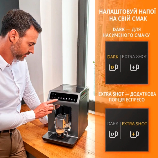 Абсолютно новий дизайн подарує незабутню перерву на каву завдяки великій ємності (резервуар для води об'ємом 2,3 л та відсік для кави зерен на 260 г), оптимальним пропорціям та ергономічному корпусу кавоварки.