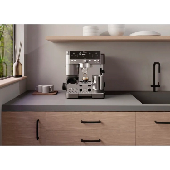 - преміальна комплектація: портафільтр, 3 чаші (одинарна, подвійна, люкс), пітчер, прес, вирва, вбудована кавомолка, щітка, набір для очищення, книга рецептів