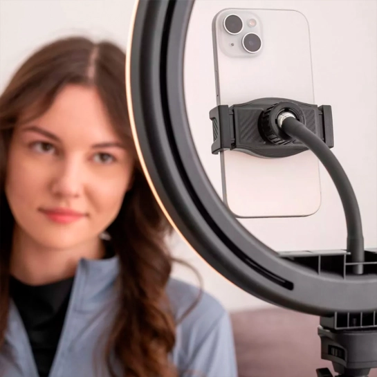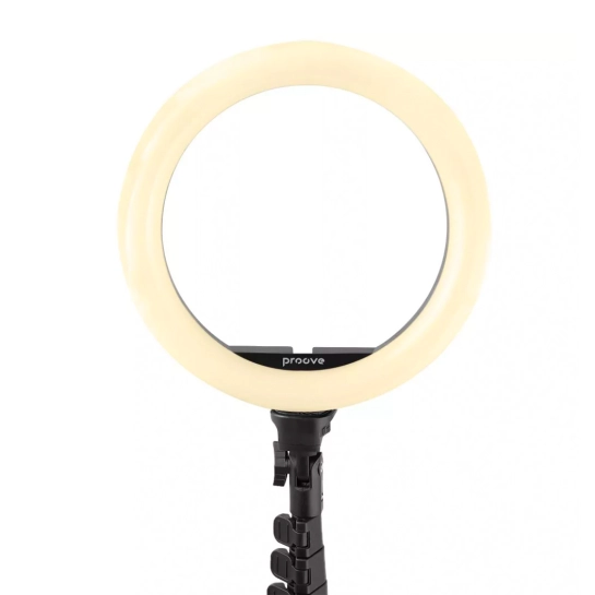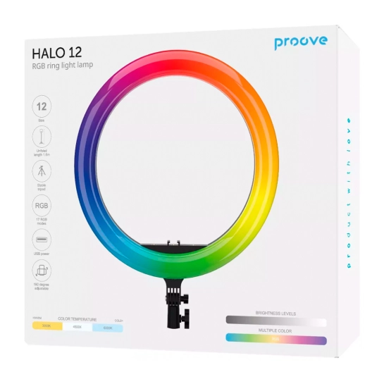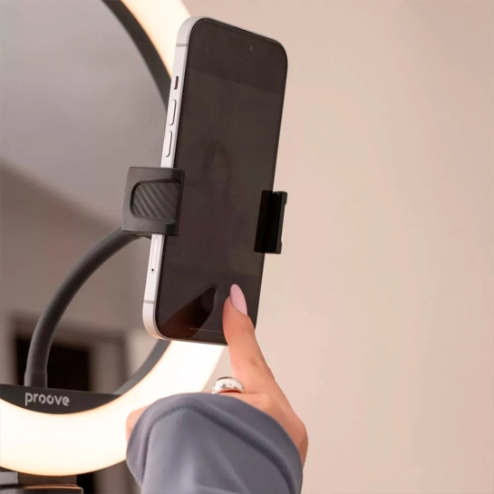 Proove Halo пропонує 17 режимів освітлення, які можна вибрати в залежності від ваших потреб, а також налаштування яскравості для створення ідеального освітлення. Смартфон легко розміщується у центрі світлодіодного кільця для створення якісних кадрів. У комплекті передбачено пульт дистанційного керування, що забезпечує максимальну зручність використання.