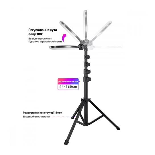 Штатив може розкладатися до 1,6 метрів, що дозволяє адаптувати його для зйомки або інших завдань на будь-якій висоті. Зручна система регулювання забезпечує легке налаштування та надійну фіксацію обраного положення, гарантуючи стабільність та комфорт у використанні.