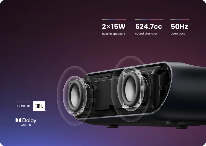 Цей проєктор оснащений системою SOUND BY JBL з двома 15-ватними динаміками, звуковою камерою об'ємом 624,7 см3, глибокими басами до 50 Гц і підтримкою Dolby Audio, що забезпечує звук кінотеатральної якості від глибоких низьких до чітких високих частот.