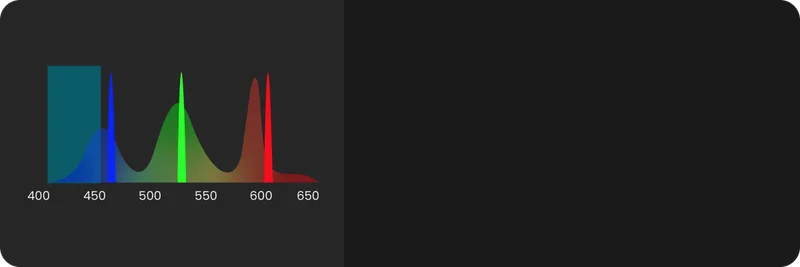 Потрійна лазерна технологія RGB природним чином уникає шкідливого діапазону синього світла 415-455 нм, запобігаючи потенційній небезпеці від синього світла.