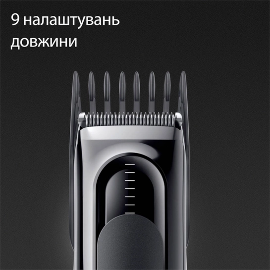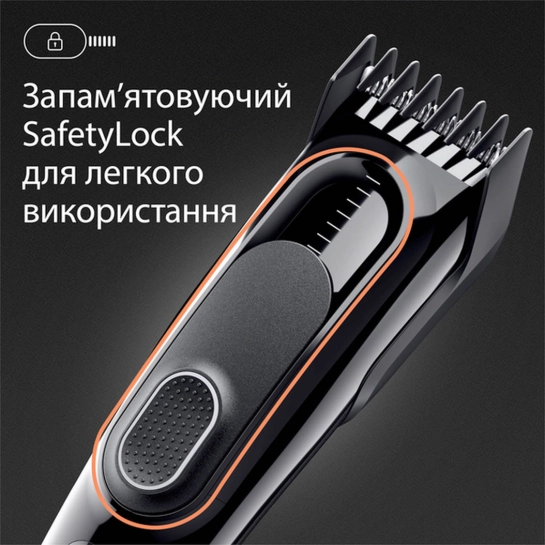 Машинка має 9 варіантів довжини стрижки з використанням насадки (від 3 до 24 мм) і можливість роботи без неї для створення більш коротких стрижок. Система SafetyLock фіксує останнє вибране налаштування, що дозволяє зберігати однакову довжину при повторних процедурах. Така функціональність ідеально підходить для точного підбору довжини та спрощує догляд за зачіскою в домашніх умовах.