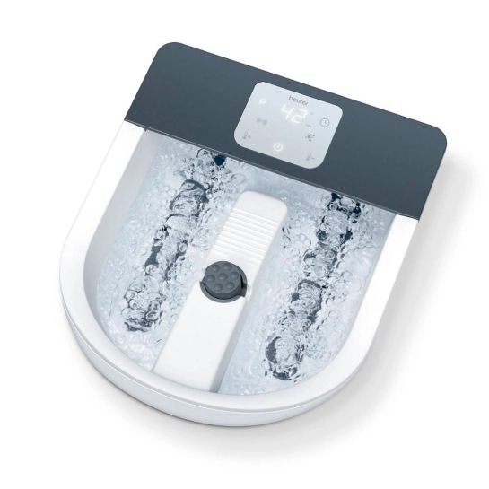 Масажна ванна для ніг з потужним нагріванням води. Вісім рівнів температури води. Розслаблюючий вібраційний та бульбашковий масаж. Підходить для ступні до 51 розміру.