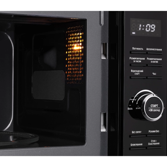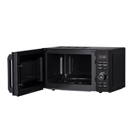 І корпус, і скло на дверцятах мікрохвильової печі виконані в чорному кольорі – трендовий дизайн завжди. Праворуч від дверцят, що мають бічне відкриття, вбудований дисплей, кнопки програм та поворотний перемикач. 700 Вт потужності розподілено на 5 рівнів (20%, 40%, 60%, 80%, 100%), тому можна вибирати необхідний відповідно до потреб. Потужність: 1200 Вт (мікрохвилі). Зсередини внутрішня камера об'ємом 20 літрів покрита емаллю. Пекти оснащена системою поворотного столу, тому в комплекті поставки міститься: сам скляний стіл (24,5 см), опора до нього, вісь обертання і, до того ж, інструкція з експлуатації з гарантійним талоном.