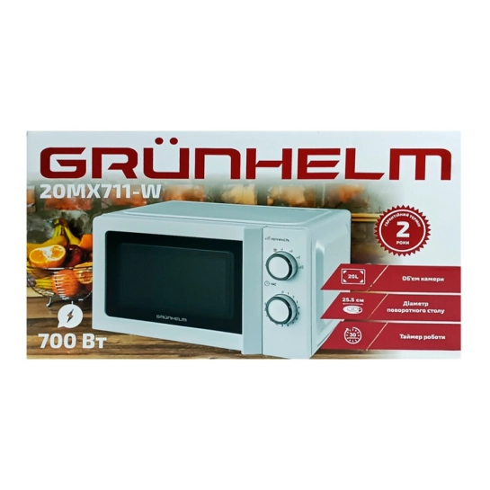 Діаметр поворотного піддону 245 мм і функції, такі як таймер, швидкий старт, підсвічування камери, а також піднос, що обертається, роблять цю модель ідеальним вибором для будь-якої домогосподарки. Grunhelm 20MX711 пропонує все необхідне для зручності та швидкості приготування страв.
