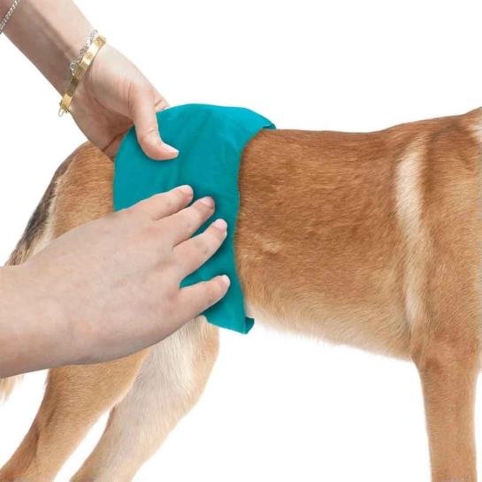 Перед першим використанням виперіть усі підкладки для видалення виробничих забруднень та активації вбираючих властивостей матеріалу. Розгорніть підкладку та визначте внутрішню вбираючу та зовнішню водонепроникну сторони. Розташуйте підкладку вбираючою стороною до живота собаки так, щоб вона покривала область геніталій. Обгорніть протектор навколо живота та закріпіть застібки на спині собаки. Відрегулюйте щільність посадки так, щоб підкладка сиділа надійно, але не стискала тіло — між протектором та тілом повинні вільно проходити два пальці.