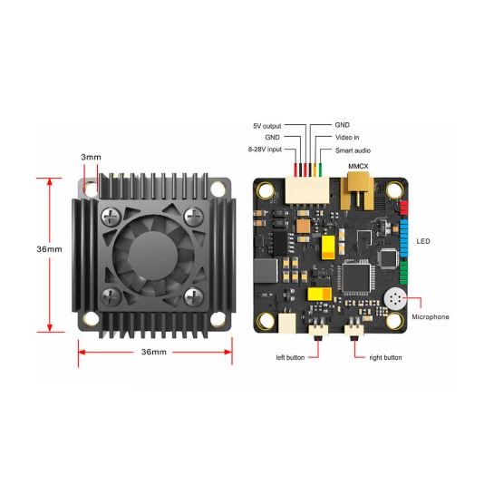 - Підтримка конфігурації Betaflight.OSD з використанням інтелектуального звуку Переключається потужність 250/500/1000/2000/3000 мВт