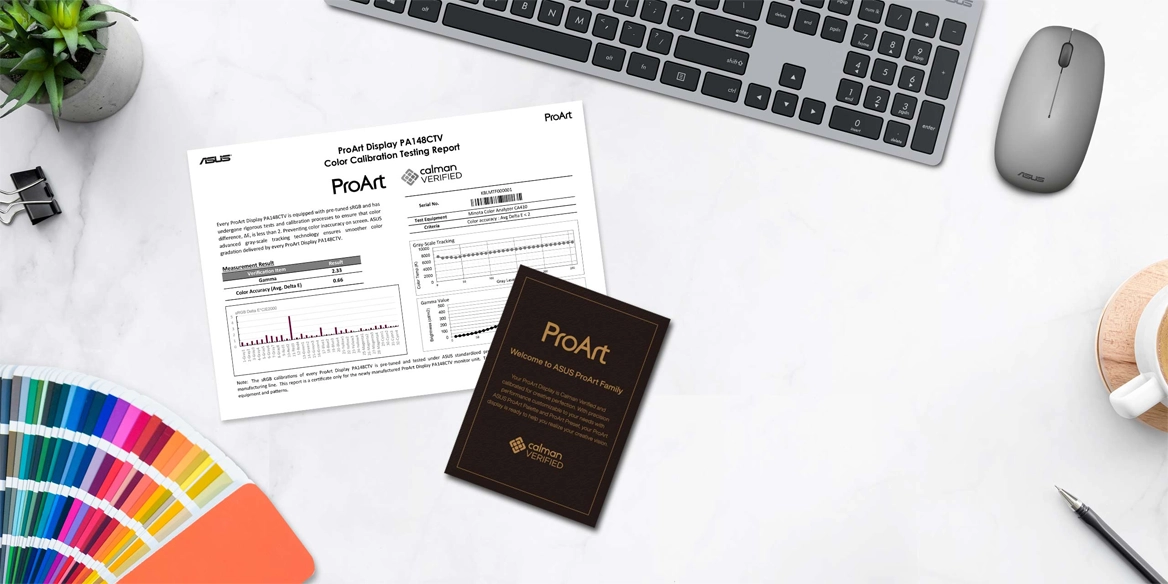 Кожен екземпляр ProArt PA148CTV проходить ретельне заводське калібрування, а в комплекті поставляється докладний звіт про точність кольору. Це підтверджує, що ви отримуєте справді професійний інструмент, готовий до роботи одразу з коробки.