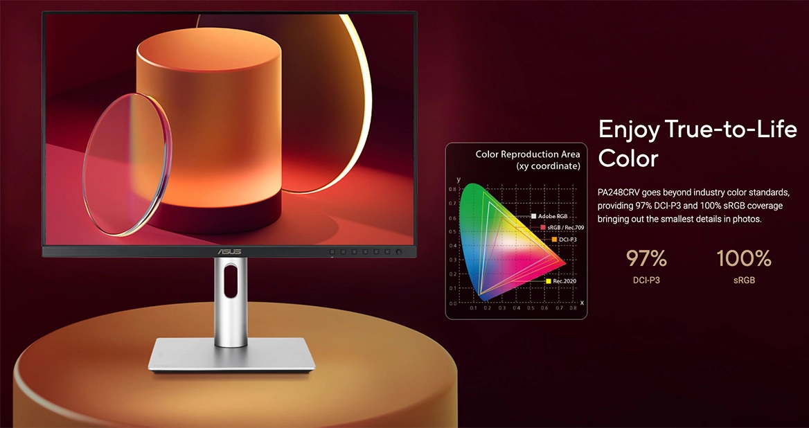 ProArt Display PA248CRV – монітор, створений для професіоналів у сфері візуального мистецтва. Він ідеально підходить для режисерів, відеомонтажерів, колористів, дизайнерів і фотографів, які цінують бездоганну перенесення кольорів, точність і комфорт в роботі.