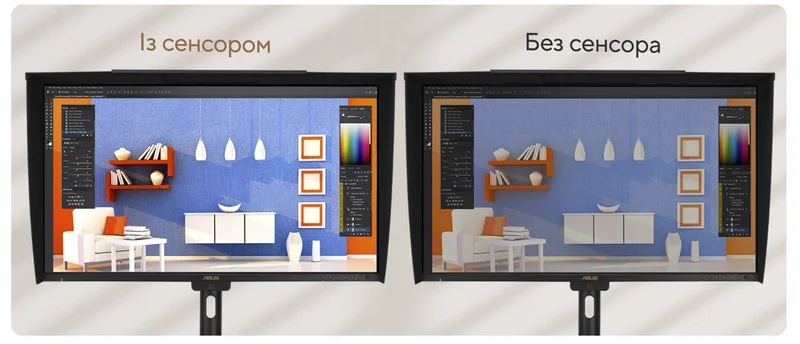 Монітори ProArt оснащені технологією ASUS Light Sync, яка передбачає наявність двох сенсорів, що забезпечують надзвичайно високу точність відтворення кольорів і точну колірну температуру відразу після ввімкнення.