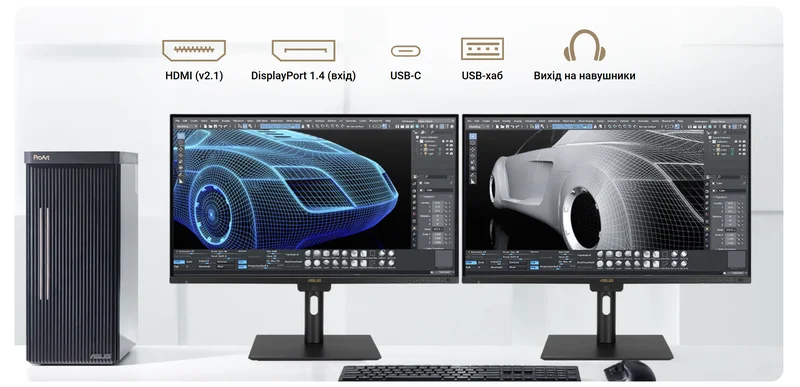 Окрім USB-C, монітор ProArt пропонує широкий вибір інших інтерфейсів підключення, зокрема HDMI, DisplayPort, USB Type-A, додатковий порт USB-C (downstream) і аудіороз’єм для навушників для сумісності з різноманітними пристроями.